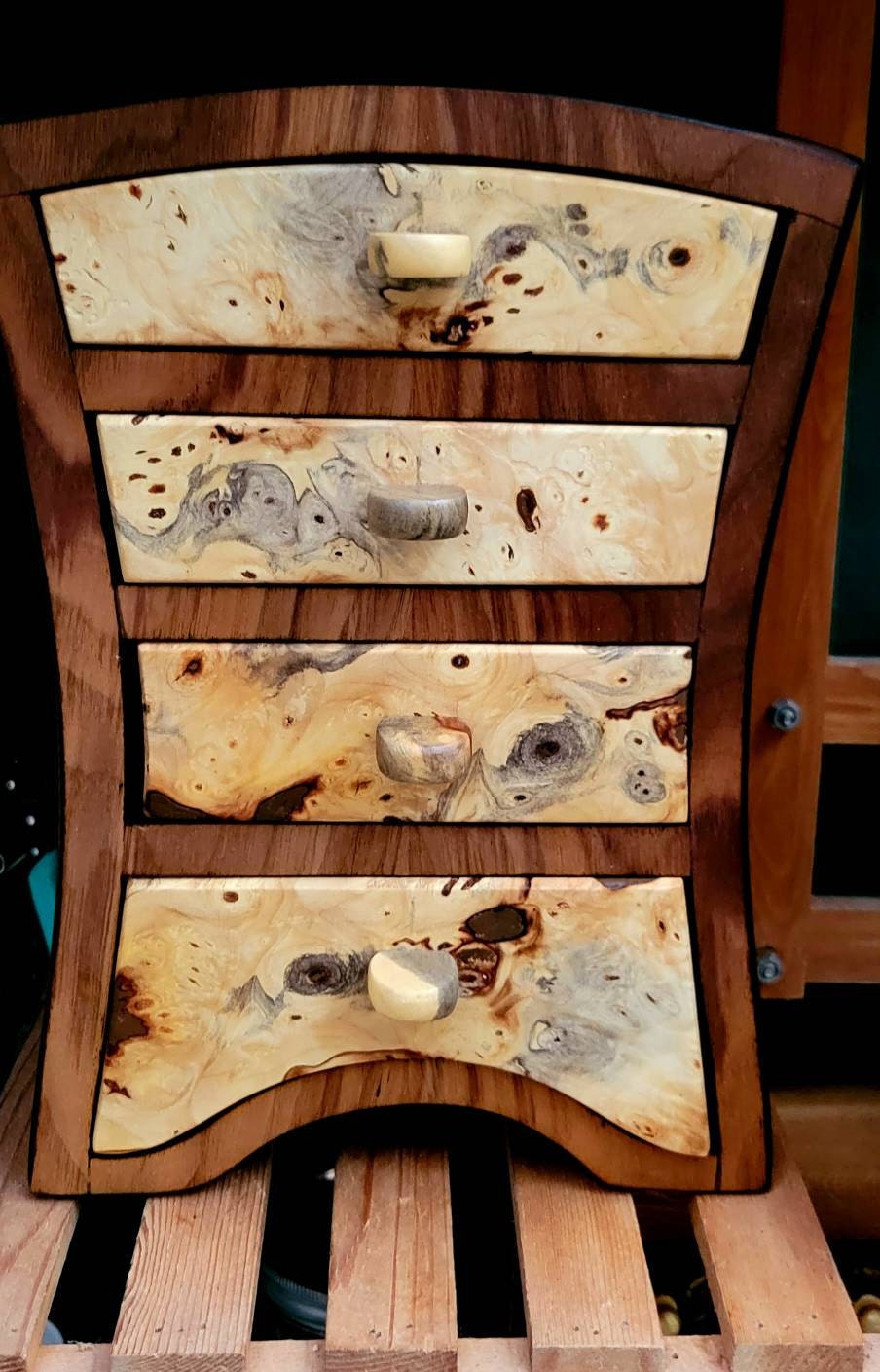 A beautiful box to make a great addition to any desk or end table. The box is well made and finished in satin lacquer and wet sanded to obtain a smooth surface. The box measures 11 inches tall x 5 and a half inches deep x 8 inches wide and weighs 5 pounds.